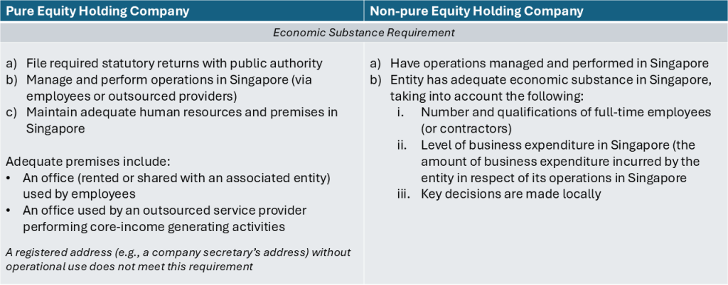 To recap, foreign-sourced gains from the disposal of foreign assets (excluding intellectual property rights) are not subject to tax in Singapore—provided that the entity has adequate economic substance during the relevant basis period. This requirement is assessed at the entity level, not the group level.